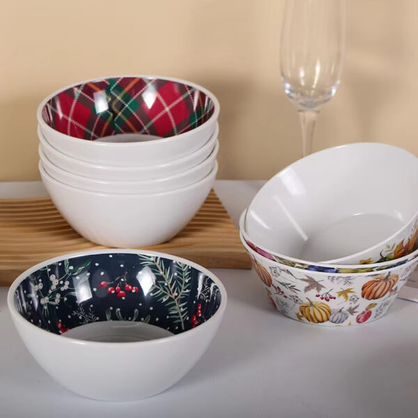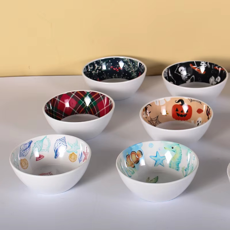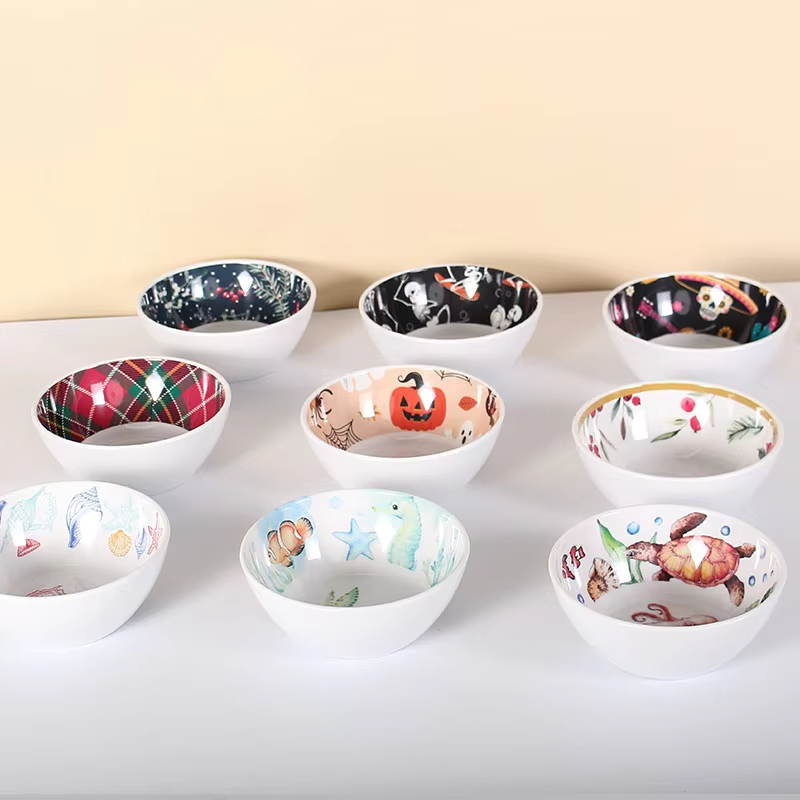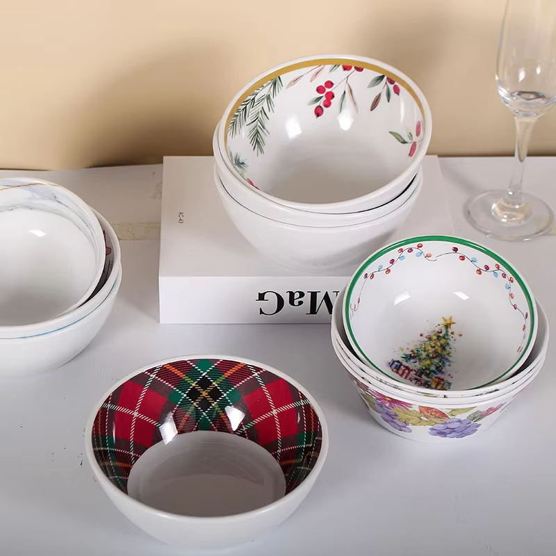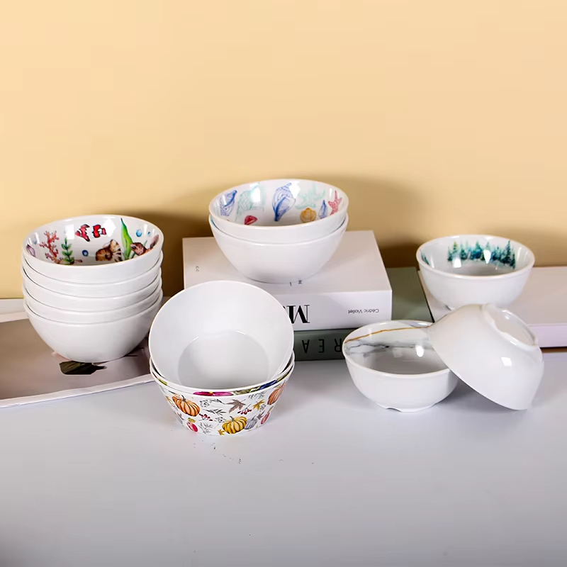 Fired at high temperatures, ceramic colors can change and are difficult to keep vibrant. Decorative effect is slightly inferior compared to melamine tableware.